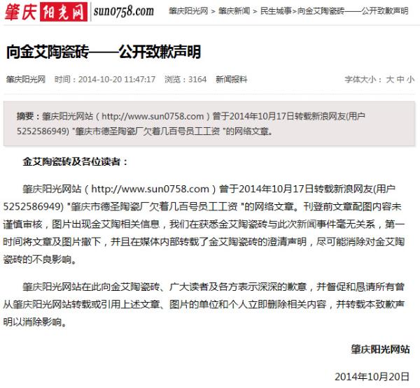 肇慶陽光網向金艾陶瓷磚——公開致歉聲明