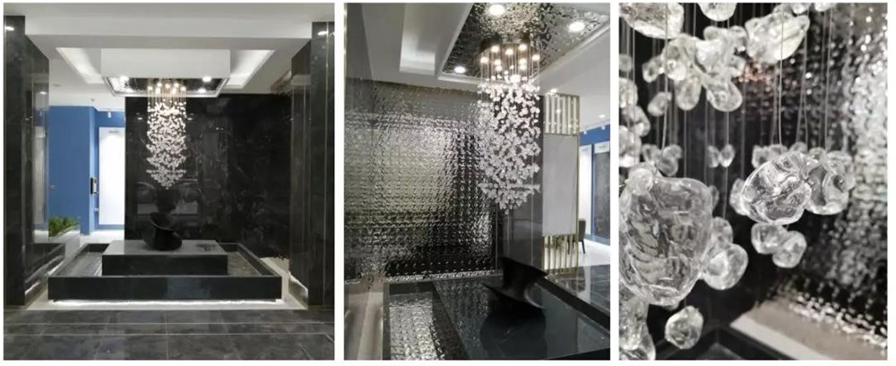 入口大堂入眼就是一個中央景觀形象區,選用黑色的大理石搭配晶瑩剔透的瀑布水晶燈,璀璨奪目,高級感一下子提升上來