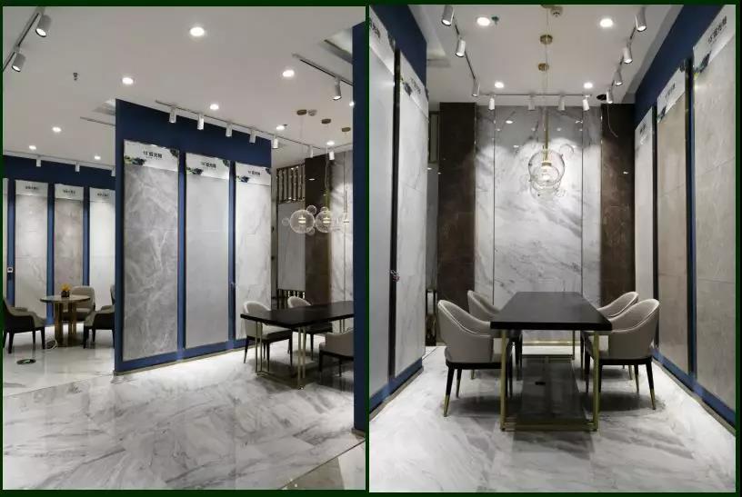 900*1800的大板以屏風的形式展現,不但很巧妙的體現了大巖板系列產品的紋理和設計感,而且通過系列的屏風展示很巧妙的把大堂區域兩邊劃分為接待區和洽談區,靜/動兩個區。