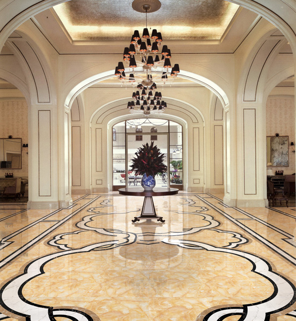 此高級大堂運用陶瓷一線品牌金艾陶玉石瓷磚煙霞玉KYP8023瓷磚鋪貼,保留原有的寶玉的特質賦予了奢靡,華麗加以拼花、波打線的搭配更是彰顯一種生活態度、一種品味、一種格調的象征。使整個大堂粗獷大氣、外觀高雅,名士尊貴,經典永鑄!