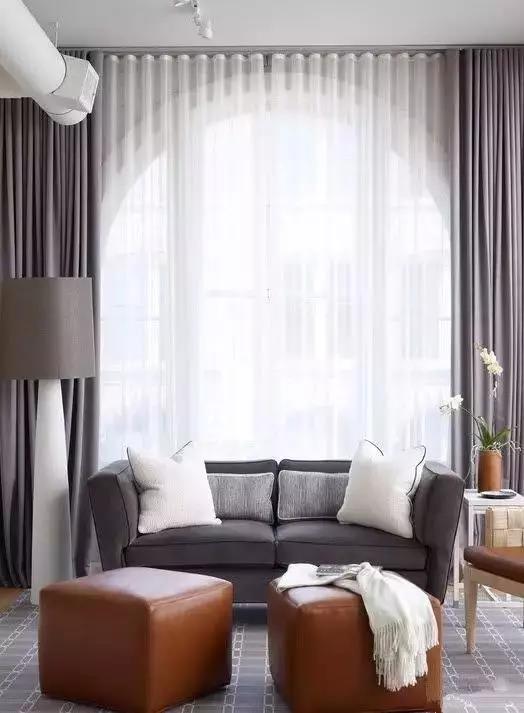 客廳:較大的客廳宜用落地布藝窗簾,可以配窗紗,不需遮光布,款式上可加配